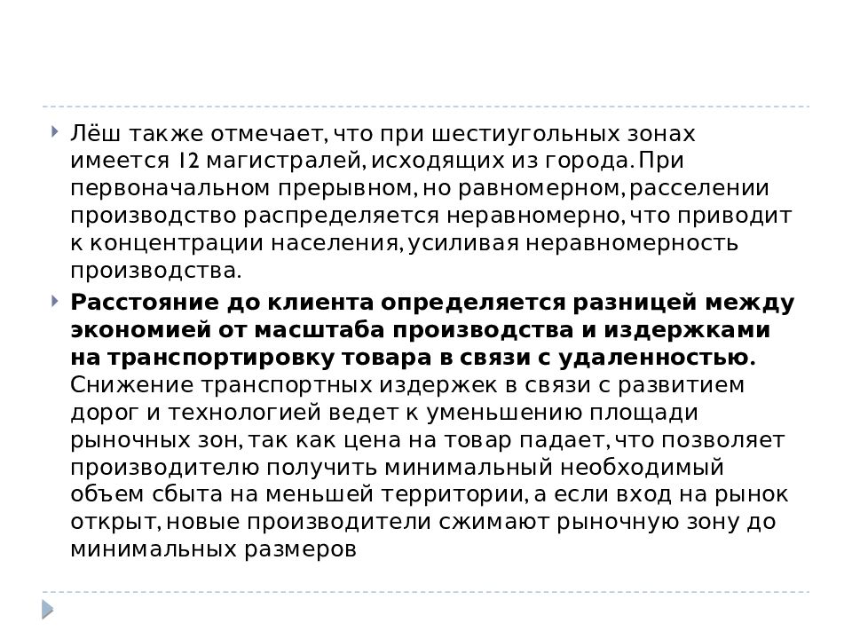 Лёш также отмечает, что при шестиугольных зонах имеется 12 магистралей, исходящих из города. При первоначальном прерывном, но равномерном, расселении производство распределяется неравномерно, что приводит к концентрации населения, усиливая неравномерность производства. Расстояние до клиента определяется разницей между экономией от масштаба производства и издержками на транспортировку товара в связи с удаленностью. Снижение транспортных издержек в связи с развитием дорог и технологией ведет к уменьшению площади рыночных зон, так как цена на товар падает, что позволяет производителю получить минимальный необходимый объем сбыта на меньшей территории, а если вход на рынок открыт, новые производители сжимают рыночную зону до минимальных размеров