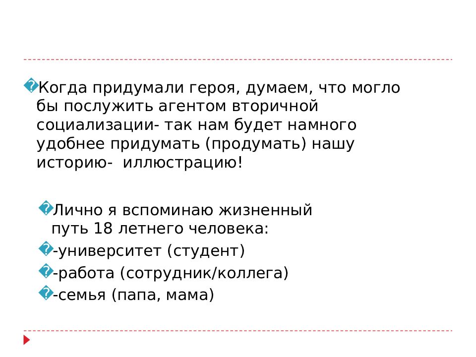 Когда придумали героя, думаем, что могло бы послужить агентом вторичной социализации- так нам будет намного удобнее придумать (продумать) нашу историю- иллюстрацию! Лично я вспоминаю жизненный путь 18 летнего человека: -университет (студент) -работа (сотрудник/коллега) -семья (папа, мама)