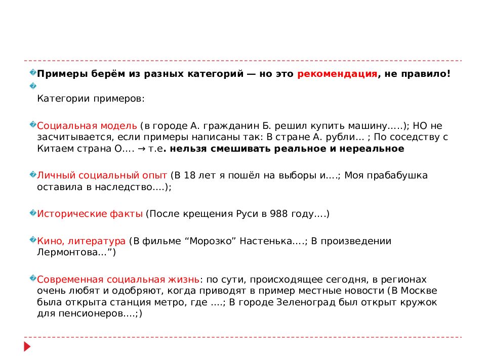 Примеры берём из разных категорий — но это рекомендация, не правило! Категории примеров: Социальная модель (в городе А. гражданин Б. решил купить машину…..); НО не засчитывается, если примеры написаны так: В стране А. рубли… ; По соседству с Китаем страна О…. → т.е. нельзя смешивать реальное и нереальное Личный социальный опыт (В 18 лет я пошёл на выборы и….; Моя прабабушка оставила в наследство….); Исторические факты (После крещения Руси в 988 году….) Кино, литература (В фильме “Морозко” Настенька….; В произведении Лермонтова…”) Современная социальная жизнь : по сути, происходящее сегодня, в регионах очень любят и одобряют, когда приводят в пример местные новости (В Москве была открыта станция метро, где ….; В городе Зеленоград был открыт кружок для пенсионеров….;)