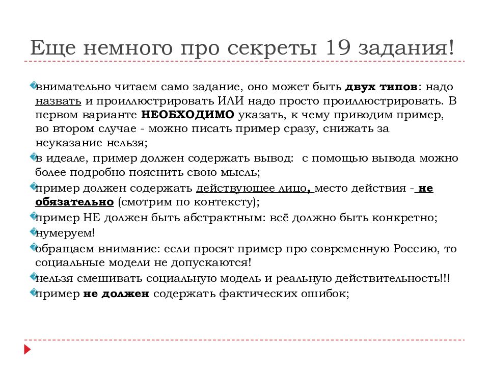внимательно читаем само задание, оно может быть двух типов : надо назвать и проиллюстрировать ИЛИ надо просто проиллюстрировать. В первом варианте НЕОБХОДИМО указать, к чему приводим пример, во втором случае - можно писать пример сразу, снижать за неуказание нельзя; в идеале, пример должен содержать вывод: с помощью вывода можно более подробно пояснить свою мысль; пример должен содержать действующее лицо, место действия - не обязательно (смотрим по контексту); пример НЕ должен быть абстрактным: всё должно быть конкретно; нумеруем! обращаем внимание: если просят пример про современную Россию, то социальные модели не допускаются! нельзя смешивать социальную модель и реальную действительность!!! пример не должен содержать фактических ошибок;