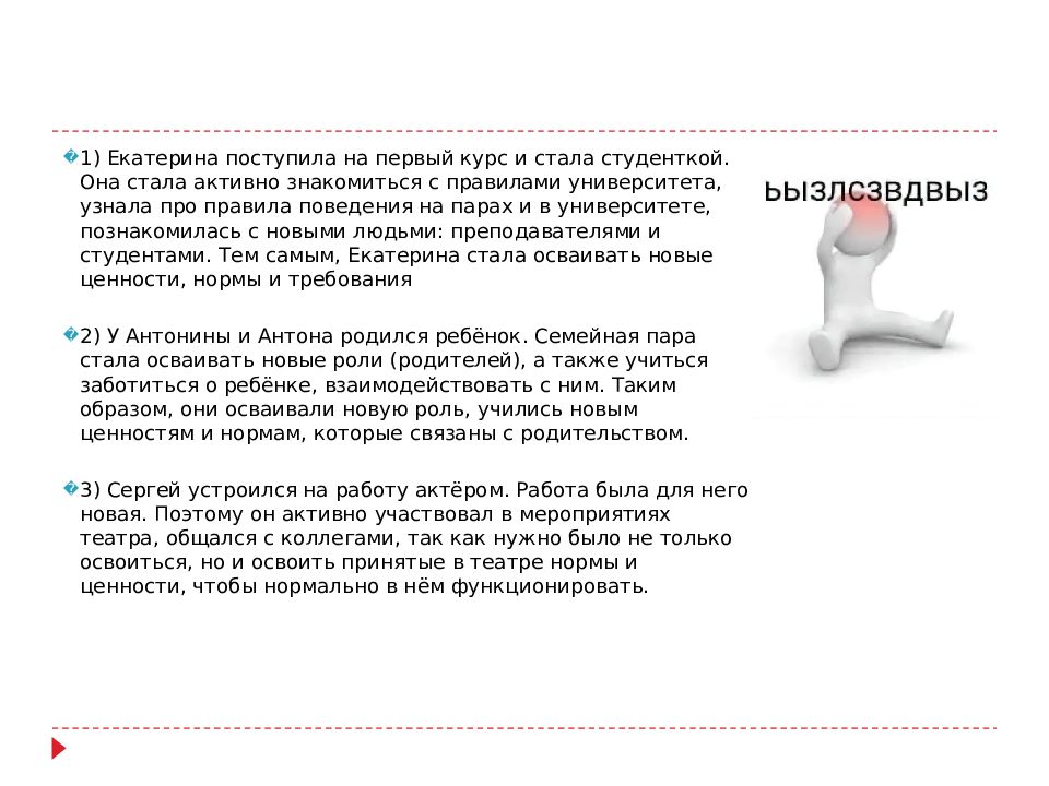 1) Екатерина поступила на первый курс и стала студенткой. Она стала активно знакомиться с правилами университета, узнала про правила поведения на парах и в университете, познакомилась с новыми людьми: преподавателями и студентами. Тем самым, Екатерина стала осваивать новые ценности, нормы и требования 2) У Антонины и Антона родился ребёнок. Семейная пара стала осваивать новые роли (родителей), а также учиться заботиться о ребёнке, взаимодействовать с ним. Таким образом, они осваивали новую роль, учились новым ценностям и нормам, которые связаны с родительством. 3) Сергей устроился на работу актёром. Работа была для него новая. Поэтому он активно участвовал в мероприятиях театра, общался с коллегами, так как нужно было не только освоиться, но и освоить принятые в театре нормы и ценности, чтобы нормально в нём функционировать.