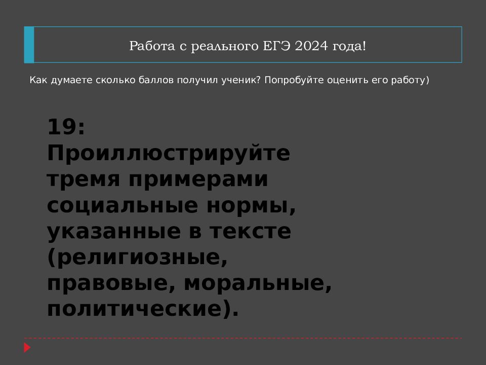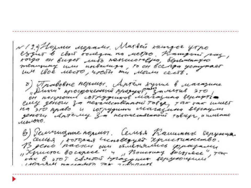 Как думаете сколько баллов получил ученик? Попробуйте оценить его работу) 19: Проиллюстрируйте тремя примерами социальные нормы, указанные в тексте (религиозные, правовые, моральные, политические).