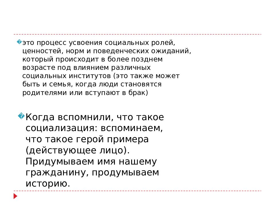 это процесс усвоения социальных ролей, ценностей, норм и поведенческих ожиданий, который происходит в более позднем возрасте под влиянием различных социальных институтов (это также может быть и семья, когда люди становятся родителями или вступают в брак) Когда вспомнили, что такое социализация: вспоминаем, что такое герой примера (действующее лицо). Придумываем имя нашему гражданину, продумываем историю.