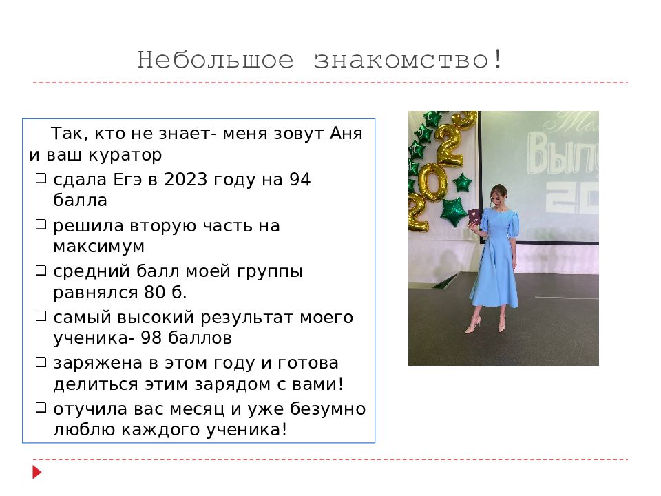 Так, кто не знает- меня зовут Аня и ваш куратор сдала Егэ в 2023 году на 94 балла решила вторую часть на максимум средний балл моей группы равнялся 80 б. самый высокий результат моего ученика- 98 баллов заряжена в этом году и готова делиться этим зарядом с вами! отучила вас месяц и уже безумно люблю каждого ученика!