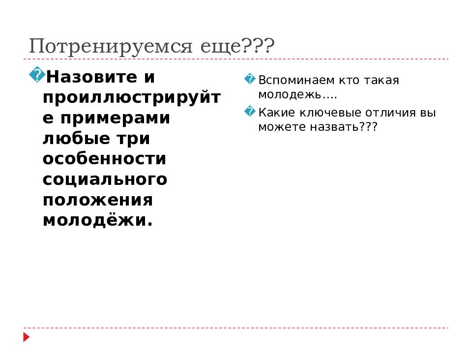 Назовите и проиллюстрируйте примерами любые три особенности социального положения молодёжи. Вспоминаем кто такая молодежь…. Какие ключевые отличия вы можете назвать???