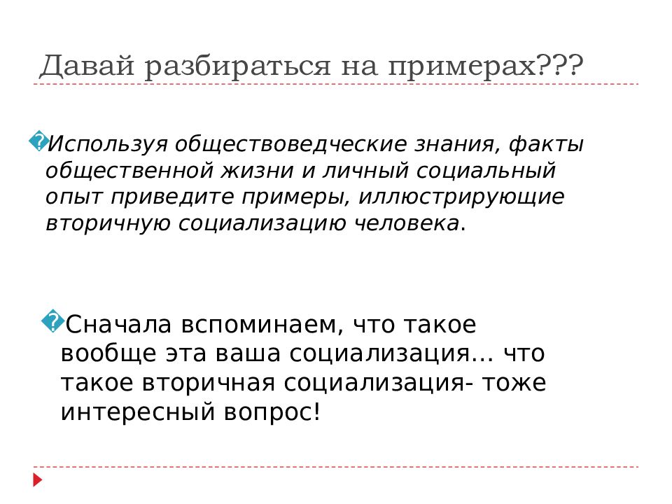 Сначала вспоминаем, что такое вообще эта ваша социализация… что такое вторичная социализация- тоже интересный вопрос! Используя обществоведческие знания, факты общественной жизни и личный социальный опыт приведите примеры, иллюстрирующие вторичную социализацию человека.