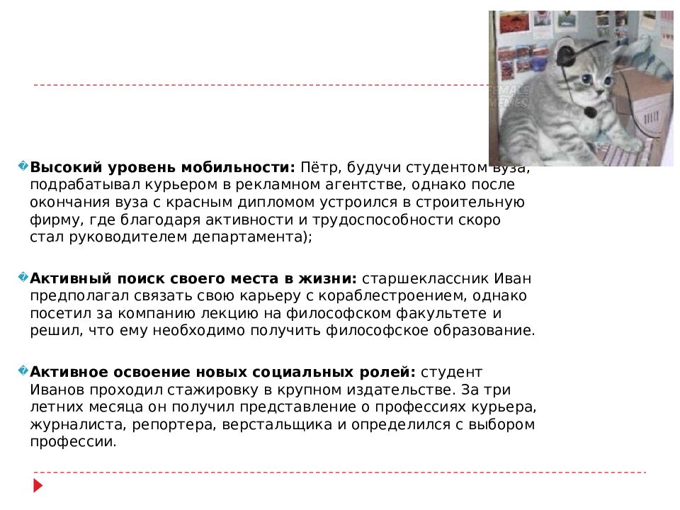 Высокий уровень мобильности: Пётр, будучи студентом вуза, подрабатывал курьером в рекламном агентстве, однако после окончания вуза с красным дипломом устроился в строительную фирму, где благодаря активности и трудоспособности скоро стал руководителем департамента); Активный поиск своего места в жизни: старшеклассник Иван предполагал связать свою карьеру с кораблестроением, однако посетил за компанию лекцию на философском факультете и решил, что ему необходимо получить философское образование. Активное освоение новых социальных ролей: студент Иванов проходил стажировку в крупном издательстве. За три летних месяца он получил представление о профессиях курьера, журналиста, репортера, верстальщика и определился с выбором профессии.