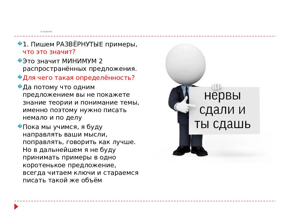 1. Пишем РАЗВЁРНУТЫЕ примеры, что это значит? Это значит МИНИМУМ 2 распространённых предложения. Для чего такая определённость? Да потому что одним предложением вы не покажете знание теории и понимание темы, именно поэтому нужно писать немало и по делу Пока мы учимся, я буду направлять ваши мысли, поправлять, говорить как лучше. Но в дальнейшем я не буду принимать примеры в одно коротенькое предложение, всегда читаем ключи и стараемся писать такой же объём