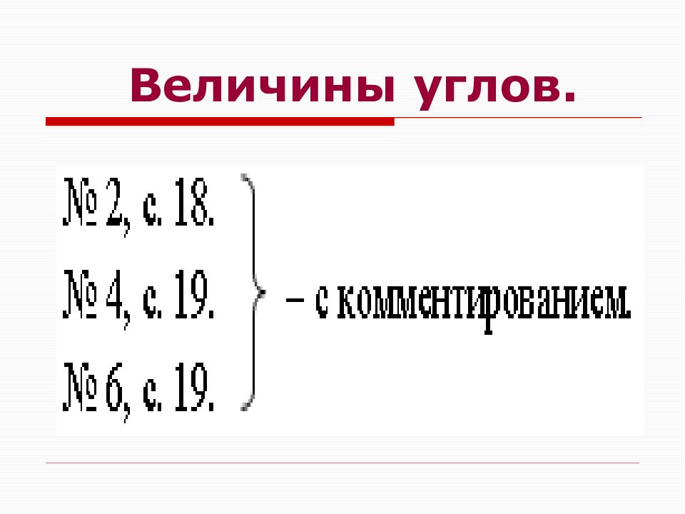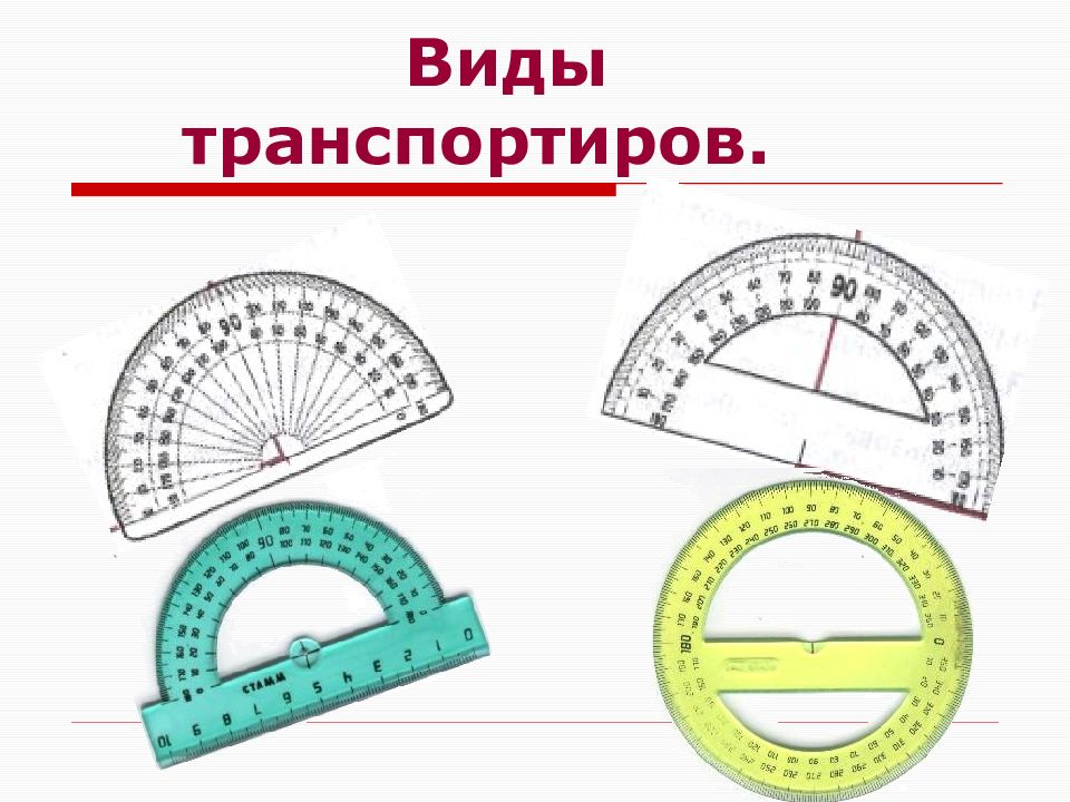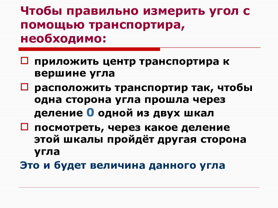 приложить центр транспортира к вершине угла расположить транспортир так, чтобы одна сторона угла прошла через деление 0 одной из двух шкал посмотреть, через какое деление этой шкалы пройдёт другая сторона угла Это и будет величина данного угла