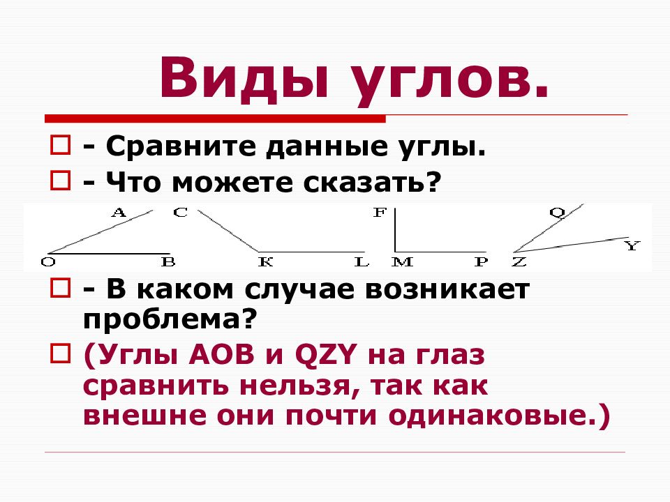 - Сравните данные углы. - Что можете сказать? - В каком случае возникает проблема? (Углы АОВ и QZY на глаз сравнить нельзя, так как внешне они почти одинаковые.)