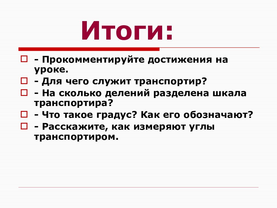 - Прокомментируйте достижения на уроке. - Для чего служит транспортир? - На сколько делений разделена шкала транспортира? - Что такое градус? Как его обозначают? - Расскажите, как измеряют углы транспортиром.