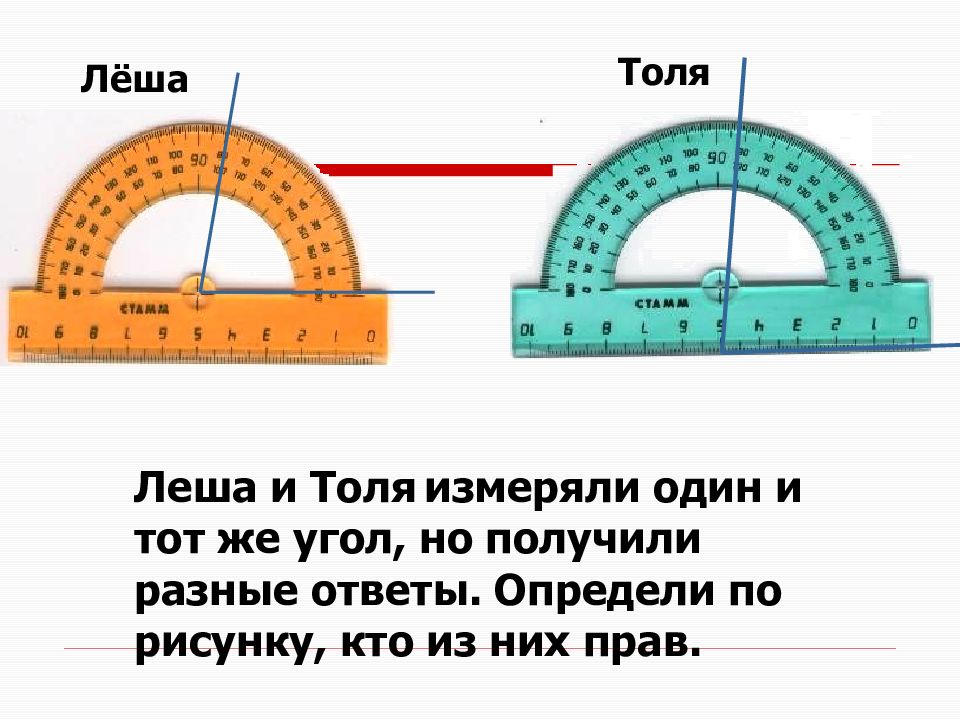 Леша и Толя измеряли один и тот же угол, но получили разные ответы. Определи по рисунку, кто из них прав. Лёша Толя