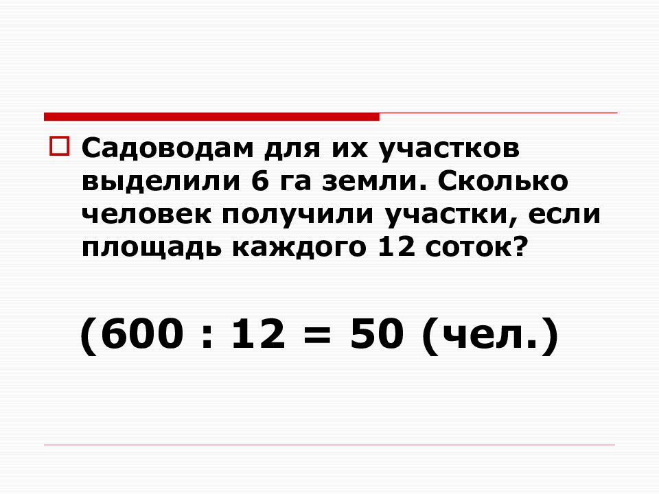 Садоводам для их участков выделили 6 га земли. Сколько человек получили участки, если площадь каждого 12 соток? (600 : 12 = 50 (чел.)