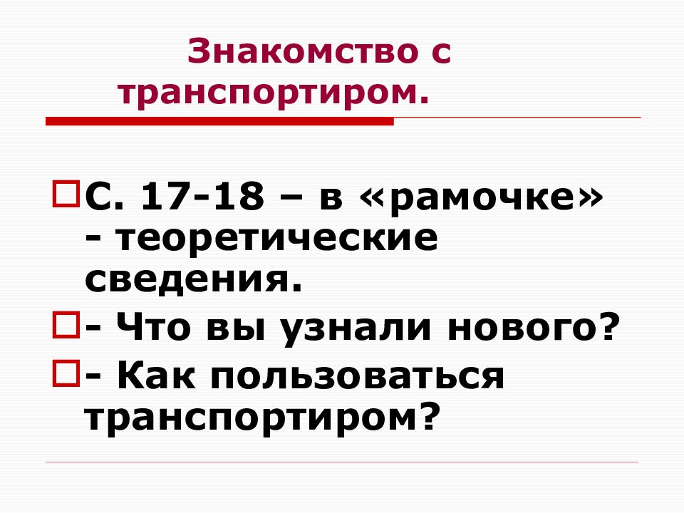 С. 17-18 – в «рамочке» - теоретические сведения. - Что вы узнали нового? - Как пользоваться транспортиром?