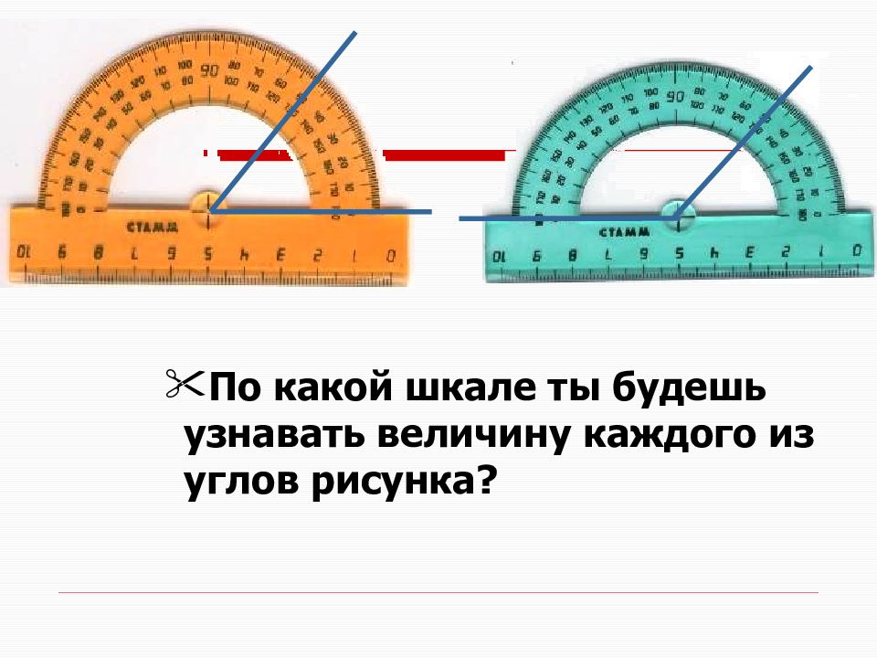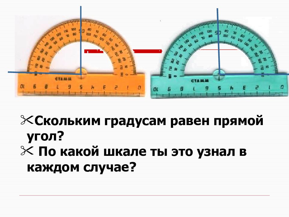 Скольким градусам равен прямой угол? По какой шкале ты это узнал в каждом случае?