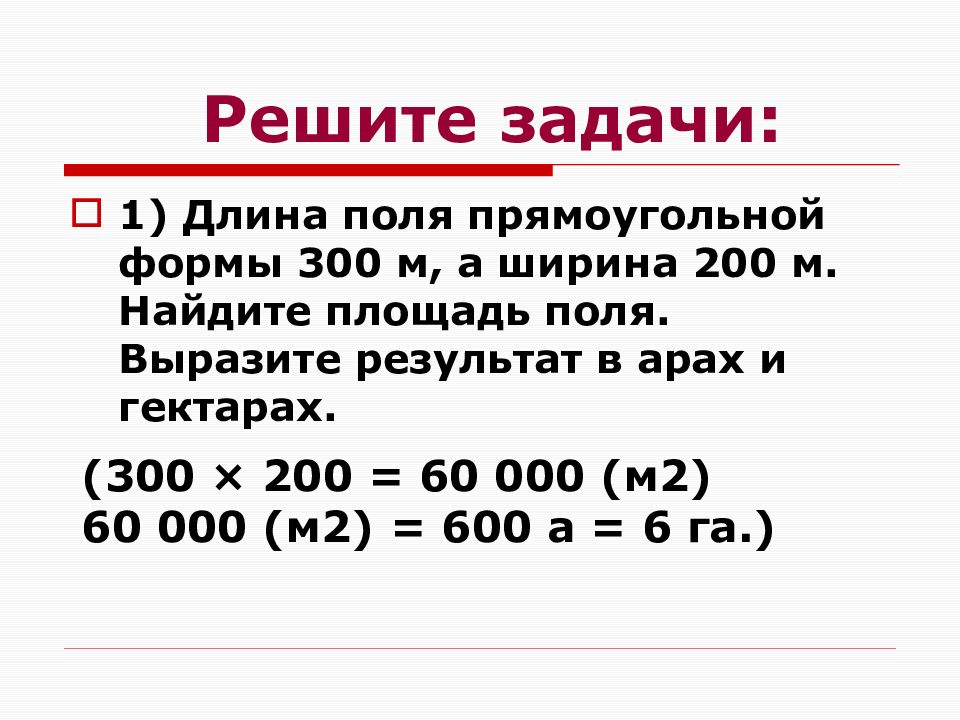 1) Длина поля прямоугольной формы 300 м, а ширина 200 м. Найдите площадь поля. Выразите результат в арах и гектарах. (300 × 200 = 60 000 (м2) 60 000 (м2) = 600 а = 6 га.)