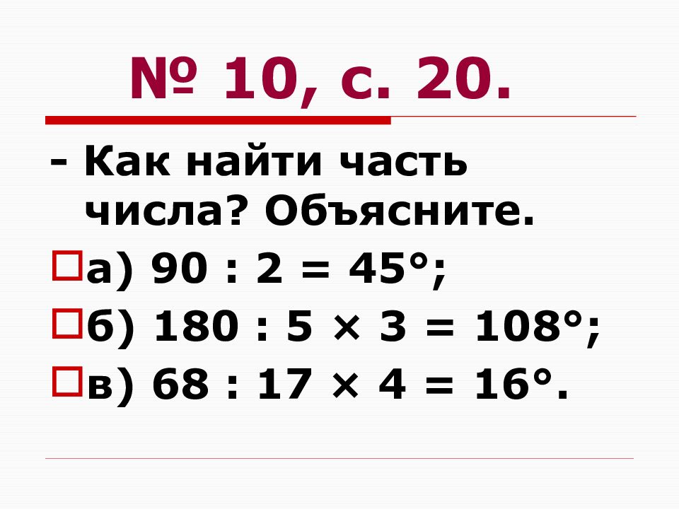 - Как найти часть числа? Объясните. а) 90 : 2 = 45°; б) 180 : 5 × 3 = 108°; в) 68 : 17 × 4 = 16°.