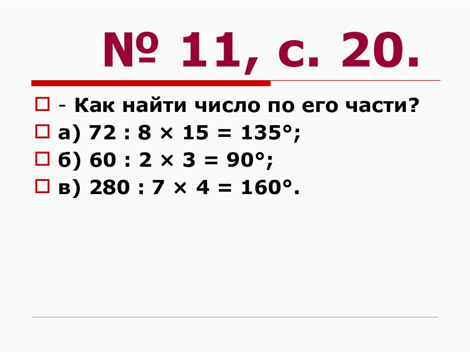 - Как найти число по его части? а) 72 : 8 × 15 = 135°; б) 60 : 2 × 3 = 90°; в) 280 : 7 × 4 = 160°.