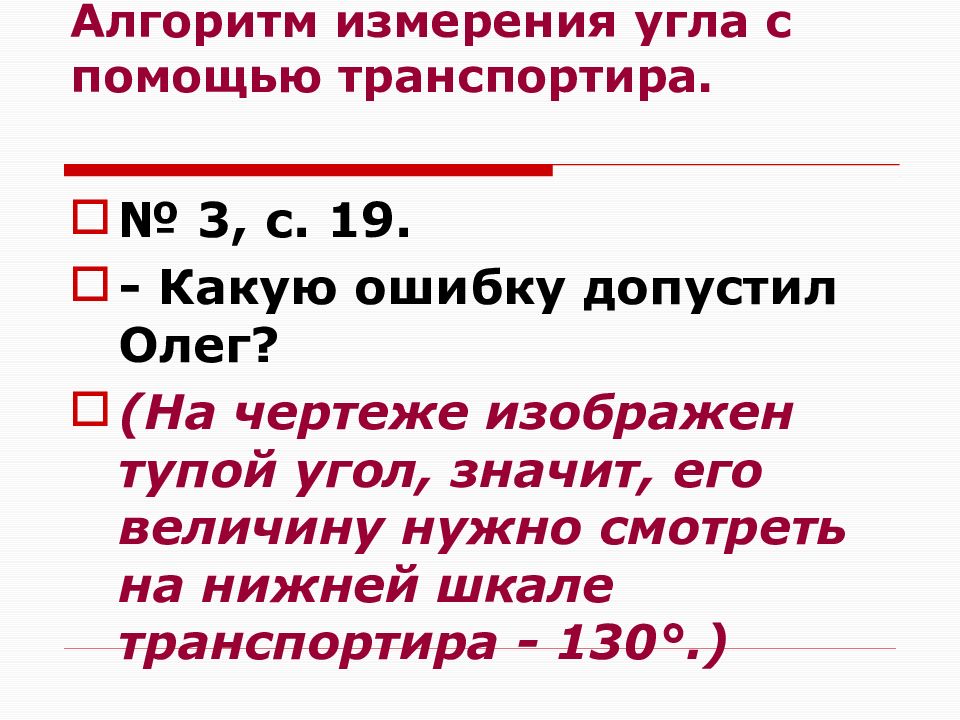 № 3, с. 19. - Какую ошибку допустил Олег? (На чертеже изображен тупой угол, значит, его величину нужно смотреть на нижней шкале транспортира - 130°.)