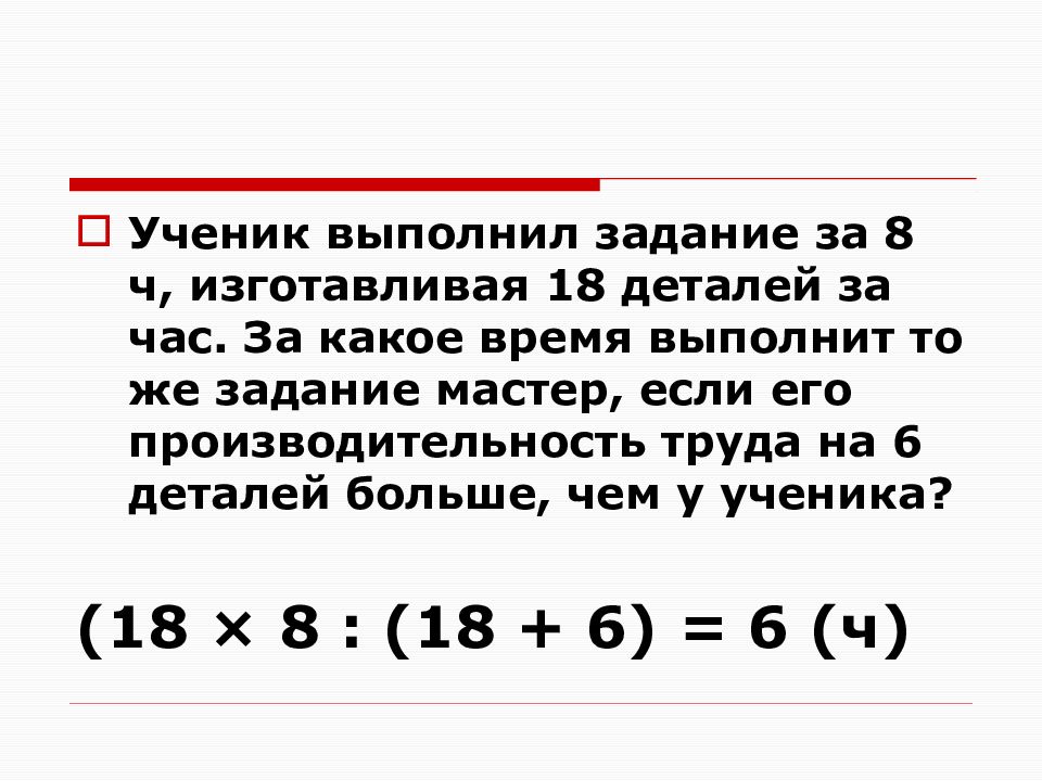 Ученик выполнил задание за 8 ч, изготавливая 18 деталей за час. За какое время выполнит то же задание мастер, если его производительность труда на 6 деталей больше, чем у ученика? (18 × 8 : (18 + 6) = 6 (ч)