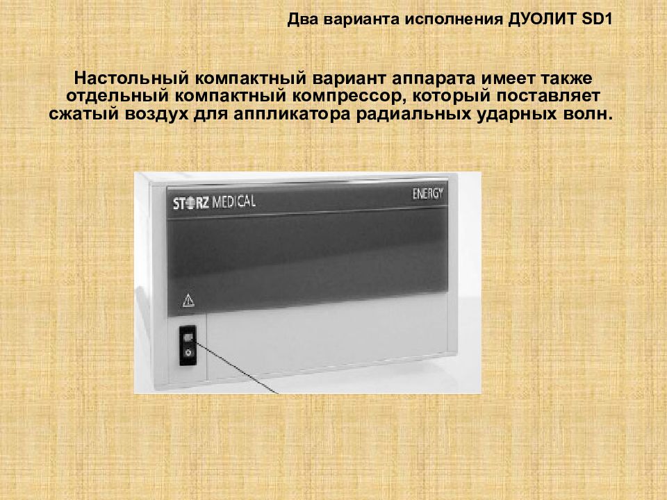Настольный компактный вариант аппарата имеет также отдельный компактный компрессор, который поставляет сжатый воздух для аппликатора радиальных ударных волн. Два варианта исполнения ДУОЛИТ SD1