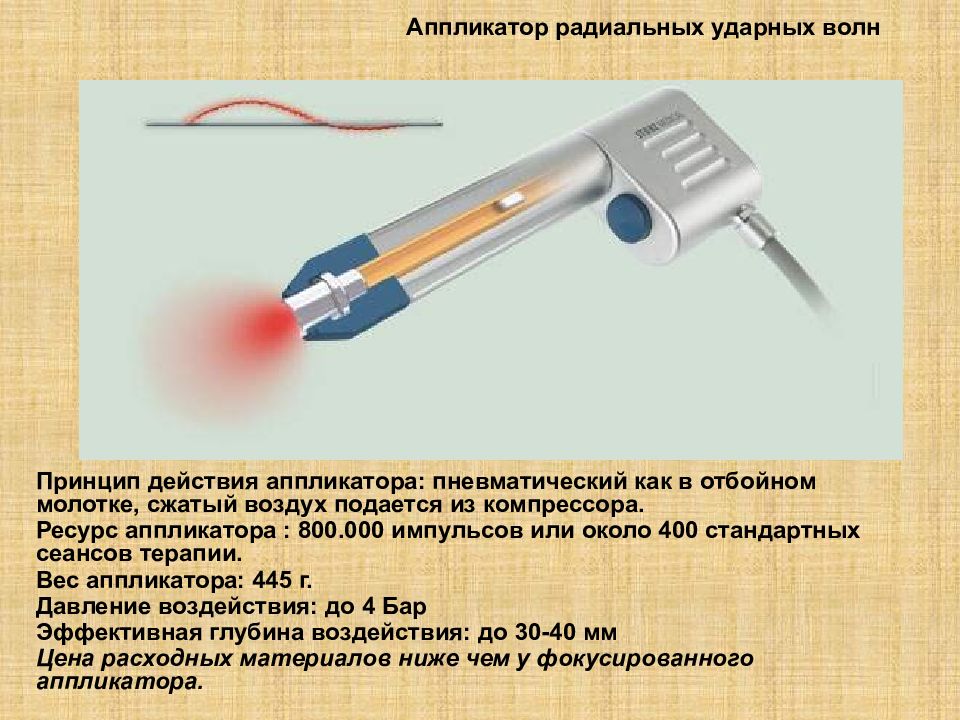 Принцип действия аппликатора : пневматический как в отбойном молотке, сжатый воздух подается из компрессора. Ресурс аппликатора : 80 0.000 импульсов или около 400 стандартных сеансов терапии. Вес аппликатора : 445 г. Давление воздействия : до 4 Бар Эффективная глубина воздействия : до 30-40 мм Цена расходных материалов ниже чем у фокусированного аппликатора. Аппликатор радиальных ударных волн