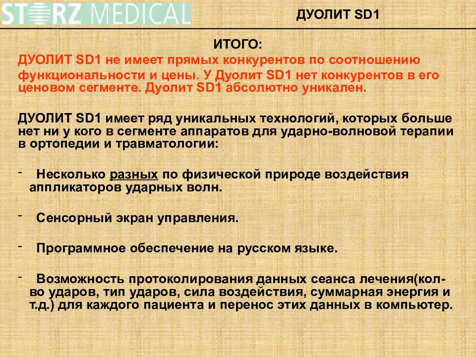 ДУОЛИТ SD1 ИТОГО : ДУОЛИТ SD1 не имеет прямых конкурентов по соотношению функциональности и цены. У Дуолит SD1 нет конкурентов в его ценовом сегменте. Дуолит SD1 абсолютно уникален. ДУОЛИТ SD1 имеет ряд уникальных технологий, которых больше нет ни у кого в сегменте аппаратов для ударно-волновой терапии в ортопедии и травматологии : Несколько разных по физической природе воздействия аппликаторов ударных волн. Сенсорный экран управления. Программное обеспечение на русском языке. Возможность протоколирования данных сеанса лечения(кол-во ударов, тип ударов, сила воздействия, суммарная энергия и т.д.) для каждого пациента и перенос этих данных в компьютер.