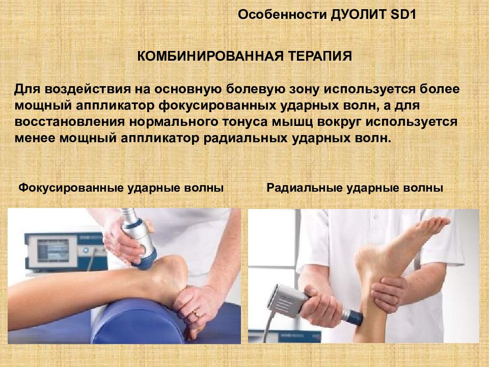 Особенности ДУОЛИТ SD 1 КОМБИНИРОВАННАЯ ТЕРАПИЯ Для воздействия на основную болевую зону используется более мощный аппликатор фокусированных ударных волн, а для восстановления нормального тонуса мышц вокруг используется менее мощный аппликатор радиальных ударных волн. Фокусированные ударные волны Радиальные ударные волны