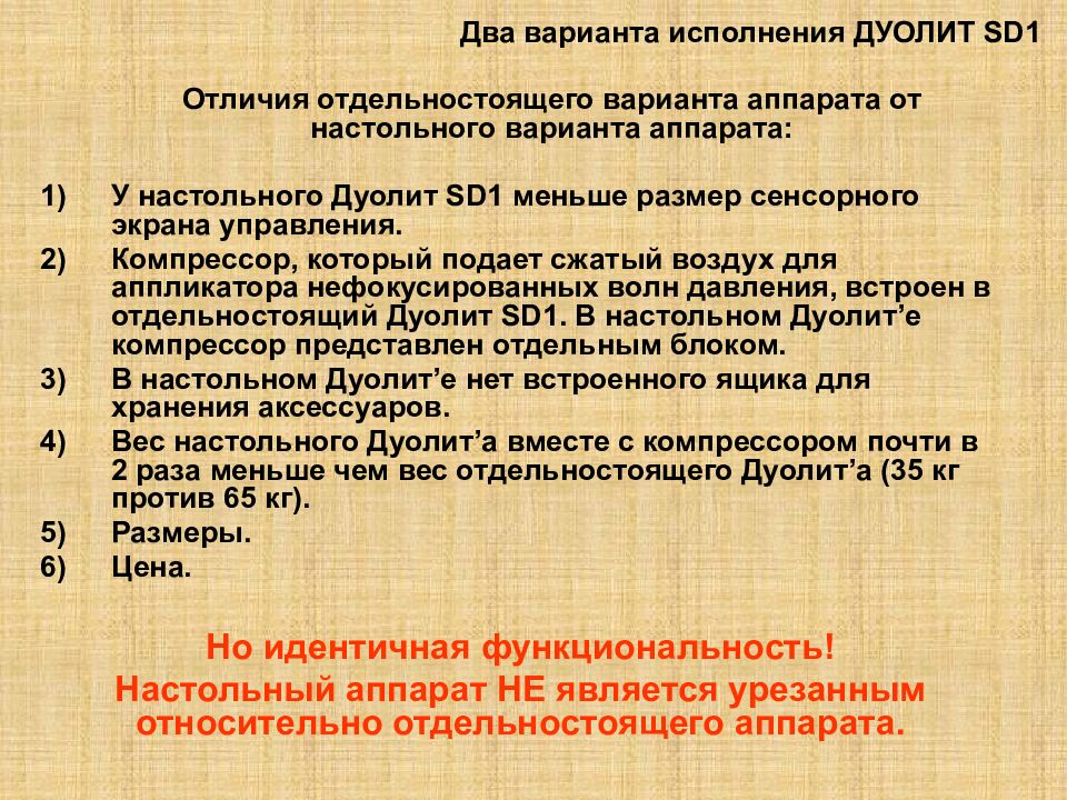 Два варианта исполнения ДУОЛИТ SD1 Отличия отдельностоящего варианта аппарата от настольного варианта аппарата : У настольного Дуолит SD1 меньше размер сенсорного экрана управления. Компрессор, который подает сжатый воздух для аппликатора нефокусированных волн давления, встроен в отдельностоящий Дуолит SD1. В настольном Дуолит ’ е компрессор представлен отдельным блоком. В настольном Дуолит ’ е нет встроенного ящика для хранения аксессуаров. Вес настольного Дуолит ’ а вместе с компрессором почти в 2 раза меньше чем вес отдельностоящего Дуолит ’ а (35 кг против 65 кг). Размеры. Цена. Но идентичная функциональность! Настольный аппарат НЕ является урезанным относительно отдельностоящего аппарата.