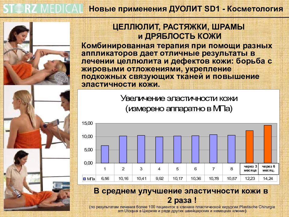 Новые применения ДУОЛИТ SD1 - Косметология ЦЕЛЛЮЛИТ, РАСТЯЖКИ, ШРАМЫ и ДРЯБЛОСТЬ КОЖИ Комбинированная терапия при помощи разных аппликаторов дает отличные результаты в лечении целлюлита и дефектов кожи : борьба с жировыми отложениями, укрепление подкожных связующих тканей и повышение эластичности кожи. через 3 месяца через 6 месяц. В среднем улучшение эластичности кожи в 2 раза ! (по результатам лечения более 100 пациенток в клинике пластической хирургии Plastische Chirurgie am Utoquai в Цюрихе и ряде других швейцарских и немецких клиник )