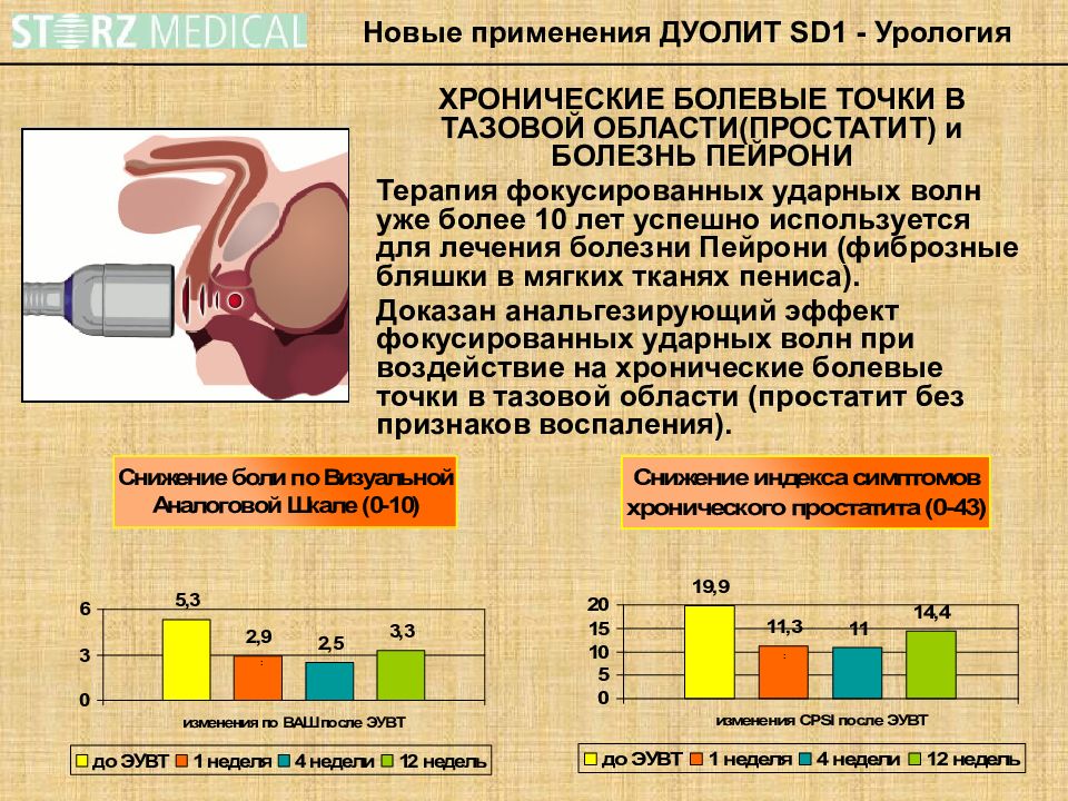ХРОНИЧЕСКИЕ БОЛЕВЫЕ ТОЧКИ В ТАЗОВОЙ ОБЛАСТИ(ПРОСТАТИТ) и БОЛЕЗНЬ ПЕЙРОНИ Терапия фокусированных ударных волн уже более 10 лет успешно используется для лечения болезни Пейрони (фиброзные бляшки в мягких тканях пениса). Доказан анальгезирующий эффект фокусированных ударных волн при воздействие на хронические болевые точки в тазовой области (простатит без признаков воспаления). Новые применения ДУОЛИТ SD1 - Урология