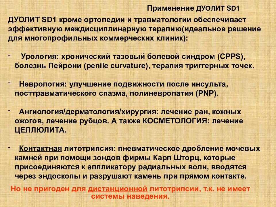 ДУОЛИТ SD1 кроме ортопедии и травматологии обеспечивает эффективную междисциплинарную терапию(идеальное решение для многопрофильных коммерческих клиник): Урология: хронический тазовый болевой синдром (CPPS), болезнь Пейрони (penile curvature), терапия триггерных точек. Неврология: улучшение подвижности после инсульта, посттравматического спазма, полиневропатия (PNP). Ангиология/дерматология/хирургия: лечение ран, кожных ожогов, лечение рубцов. А также КОСМЕТОЛОГИЯ : лечение ЦЕЛЛЮЛИТА. Контактная литотрипсия : пневматическое дробление мочевых камней при помощи зондов фирмы Карл Шторц, которые присоединяются к аппликатору радиальных волн, вводятся через эндоскопы и разрушают камень при прямом контакте. Применение ДУОЛИТ SD1 Но не пригоден для дистанционной литотрипсии, т.к. не имеет системы наведения.