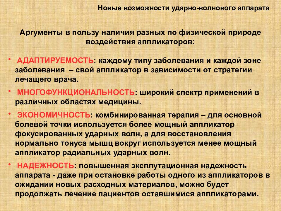 Аргументы в пользу наличия разных по физической природе воздействия аппликаторов : АДАПТИРУЕМОСТЬ : каждому типу заболевания и каждой зоне заболевания – свой аппликатор в зависимости от стратегии лечащего врача. МНОГОФУНКЦИОНАЛЬНОСТЬ : широкий спектр применений в различных областях медицины. ЭКОНОМИЧНОСТЬ : комбинированная терапия – для основной болевой точки используется более мощный аппликатор фокусированных ударных волн, а для восстановления нормально тонуса мышц вокруг используется менее мощный аппликатор радиальных ударных волн. НАДЕЖНОСТЬ : повышенная эксплутационная надежность аппарата - даже при остановке работы одного из аппликаторов в ожидании новых расходных материалов, можно будет продолжать лечение пациентов оставшимися аппликаторами. Новые возможности ударно-волнового аппарата