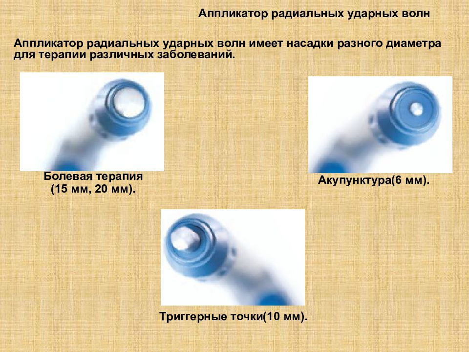 Аппликатор радиальных ударных волн имеет насадки разного диаметра для терапии различных заболеваний. Аппликатор радиальных ударных волн Болевая терапия (15 мм, 20 мм). Триггерные точки(10 мм). Акупунктура(6 мм).