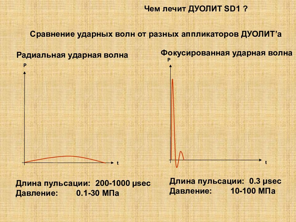 Фокусированная ударная волна Радиальная ударная волна t t P P Длина пульсации: 0.3 µsec Давление: 10-100 MПa Длина пульсации: 200-1000 µsec Давление: 0.1-30 MПa Чем лечит ДУОЛИТ SD 1 ? Сравнение ударных волн от разных аппликаторов ДУОЛИТ ’ а