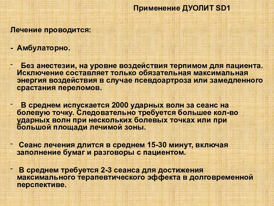 Применение ДУОЛИТ SD 1 Лечение проводится : - Амбулаторно. Без анестезии, на уровне воздействия терпимом для пациента. Исключение составляет только обязательная максимальная энергия воздействия в случае псевдоартроза или замедленного срастания переломов. В среднем испускается 2000 ударных волн за сеанс на болевую точку. Следовательно требуется большее кол-во ударных волн при нескольких болевых точках или при большой площади лечимой зоны. Сеанс лечения длится в среднем 15-30 минут, включая заполнение бумаг и разговоры с пациентом. В среднем требуется 2-3 сеанса для достижения максимального терапевтического эффекта в долговременной перспективе.