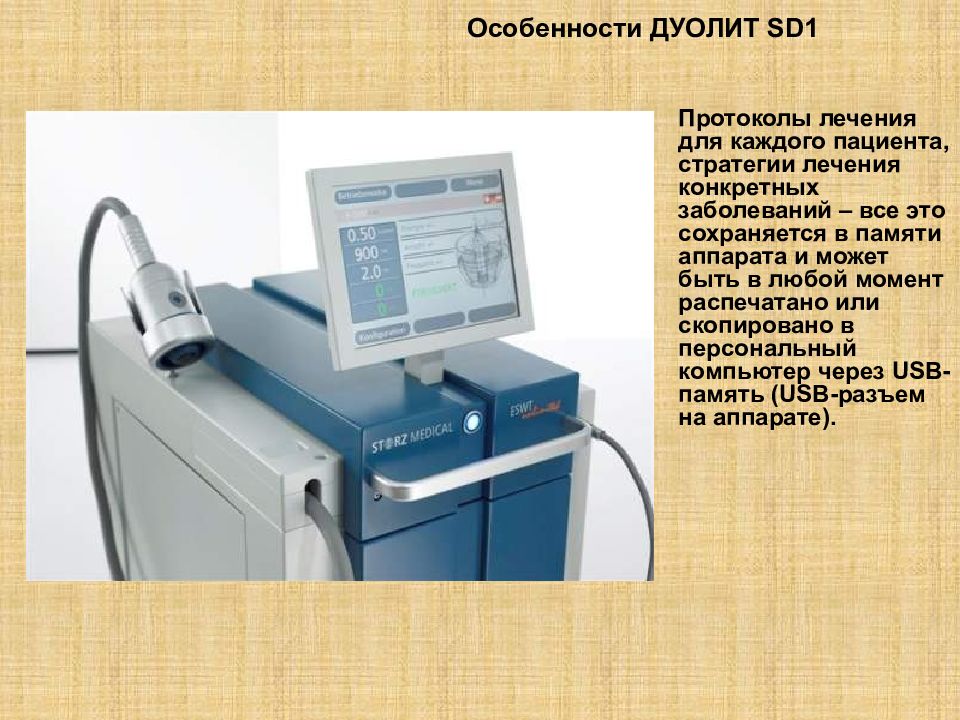 Протоколы лечения для каждого пациента, стратегии лечения конкретных заболеваний – все это сохраняется в памяти аппарата и может быть в любой момент распечатано или скопировано в персональный компьютер через USB- память ( USB- разъем на аппарате). Особенности ДУОЛИТ SD 1