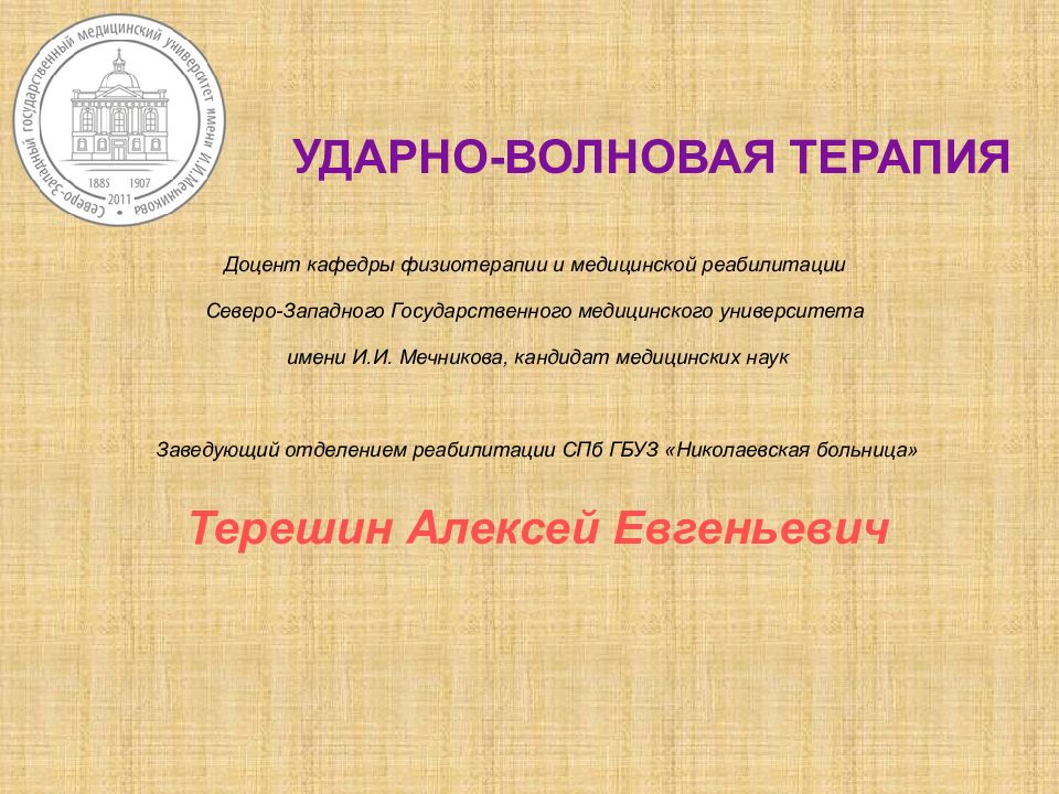 УДАРНО-ВОЛНОВАЯ ТЕРАПИЯ Доцент кафедры физиотерапии и медицинской реабилитации Северо-Западного Государственного медицинского университета имени И.И. Мечникова, кандидат медицинских наук Заведующий отделением реабилитации СПб ГБУЗ «Николаевская больница» Терешин Алексей Евгеньевич