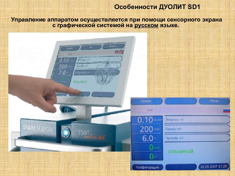 Управление аппаратом осуществляется при помощи сенсорного экрана с графической системой на русском языке. Особенности ДУОЛИТ SD 1