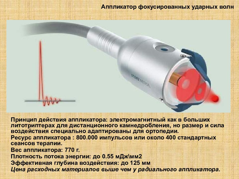 Принцип действия аппликатора : электромагнитный как в больших литотриптерах для дистанционного камнедробления, но размер и сила воздействия специально адаптированы для ортопедии. Ресурс аппликатора : 800.000 импульсов или около 4 00 стандартных сеансов терапии. Вес аппликатора : 770 г. Плотность потока энергии : до 0.55 мДж\мм2 Эффективная глубина воздействия : до 125 мм Цена расходных материалов выше чем у радиального аппликатора. Аппликатор фокусированных ударных волн