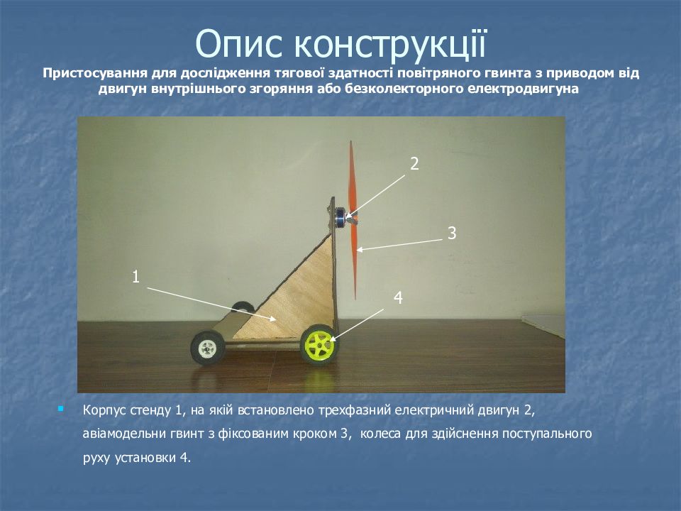 Корпус стенду 1, на якій встановлено трехфазний електричний двигун 2, авіамодельни гвинт з фіксованим кроком 3, колеса для здійснення поступального руху установки 4. 1 2 3 4