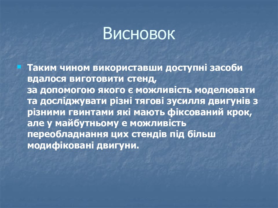 Таким чином використавши доступні засоби вдалося виготовити стенд, за допомогою якого є можливість моделювати та досліджувати різні тягові зусилля двигунів з різними гвинтами які мають фіксований крок, але у майбутньому е можливість переобладнання цих стендів під більш модифіковані двигуни.