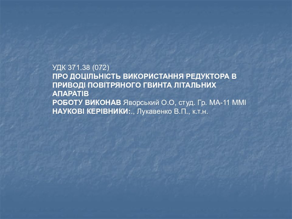 УДК 371. 38 (072) ПРО ДОЦІЛЬНІСТЬ ВИКОРИСТАННЯ РЕДУКТОРА В ПРИВОДІ ПОВІТРЯНОГО ГВИНТА ЛІТАЛЬНИХ АПАРАТІВ РОБОТУ ВИКОНАВ Яворський О.О, студ. Гр. МА-11 ММІ НАУКОВІ КЕРІВНИКИ:., Лукавенко В.П., к.т.н.
