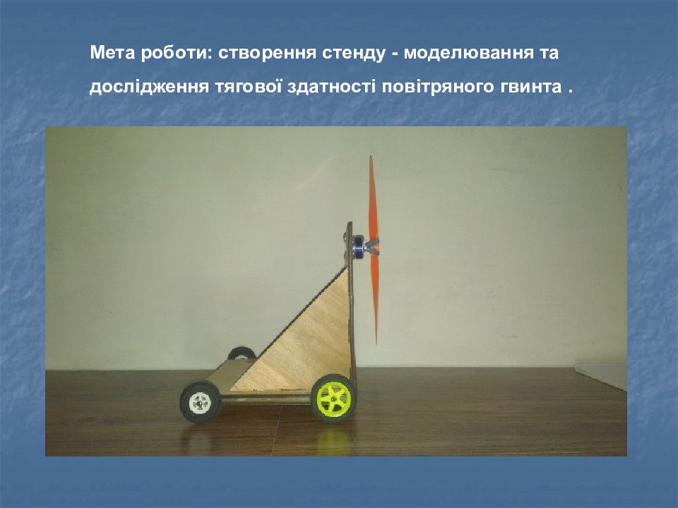 Мета роботи: створення стенду - моделювання та дослідження тягової здатності повітряного гвинта.