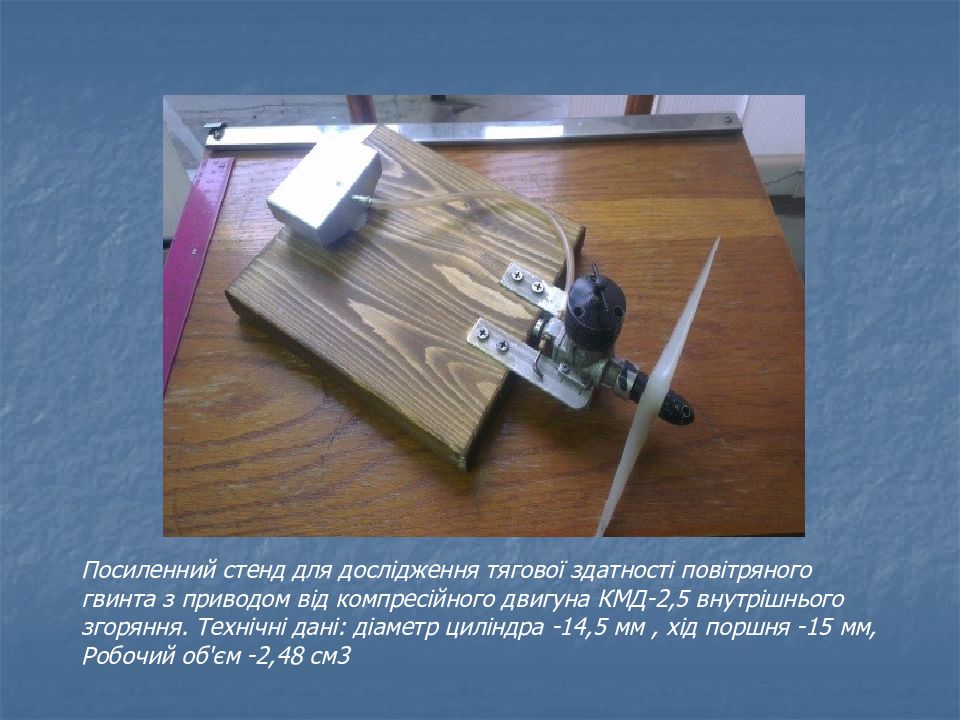 Посиленний стенд для дослідження тягової здатності повітряного гвинта з приводом від компресійного двигуна КМД-2,5 внутрішнього згоряння. Технічні дані: діаметр циліндра -14,5 мм, хід поршня -15 мм, Робочий об'єм -2,48 см3