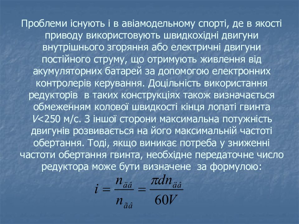 Слайд 7: Проблеми існують і в авіамодельному спорті, де в якості приводу використовують швидкохідні двигуни внутрішнього згоряння або електричні двигуни постійного струму, що отримують живлення від акумуляторних батарей за допомогою електронних контролерів керування. Доцільність використання редукторів в таких конструкціях також визначається обмеженням колової швидкості кінця лопаті гвинта V <250 м/с. З іншої сторони максимальна потужність двигунів розвивається на його максимальній частоті обертання. Тоді, якщо виникає потреба у зниженні частоти обертання гвинта, необхідне передаточне число редуктора може бути визначене за формулою: