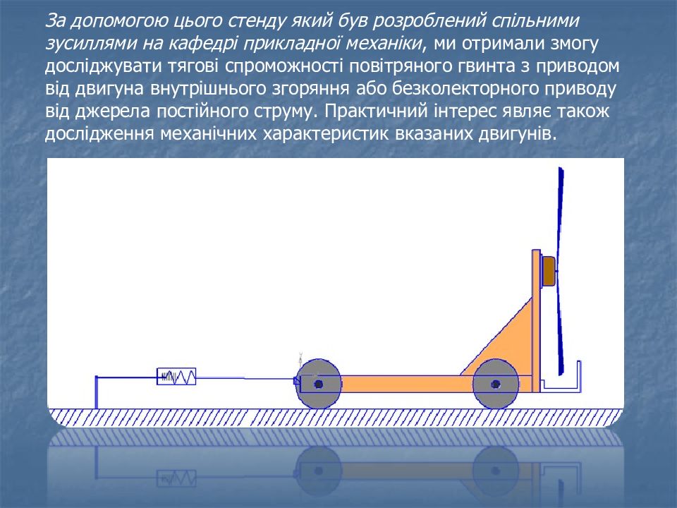 За допомогою цього стенду який був розроблений спільними зусиллями на кафедрі прикладної механіки, ми отримали змогу досліджувати тягові спроможності повітряного гвинта з приводом від двигуна внутрішнього згоряння або безколекторного приводу від джерела постійного струму. Практичний інтерес являє також дослідження механічних характеристик вказаних двигунів.