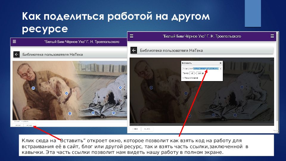 Клик сюда на “Вставить” откроет окно, которое позволит как взять код на работу для встраивания её в сайт, блог или другой ресурс, так и взять часть ссылки,заключенной в кавычки. Эта часть ссылки позволит нам видеть нашу работу в полном экране.