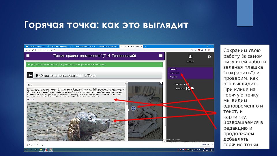 Сохраним свою работу (в самом низу всей работы зеленая плашка “сохранить”) и проверим, как это выглядит. При клике на горячую точку мы видим одновременно и текст, и картинку. Возвращаемся в редакцию и продолжаем добавлять горячие точки.