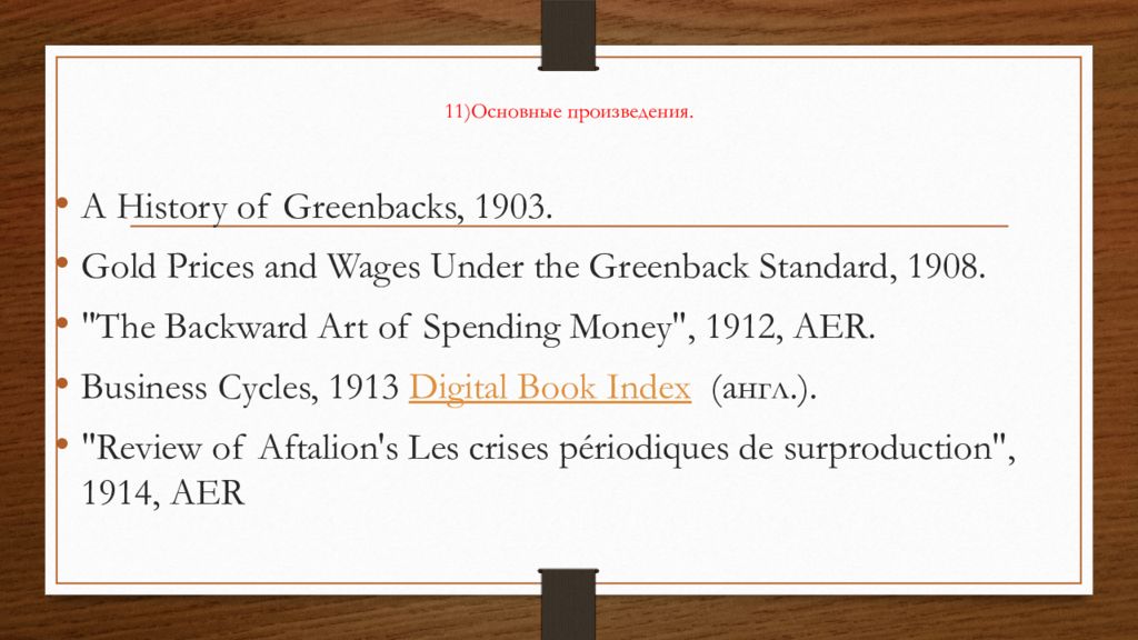 A History of Greenbacks, 1903. Gold Prices and Wages Under the Greenback Standard, 1908. "The Backward Art of Spending Money", 1912, AER. Business Cycles, 1913 Digital Book Index ( англ.). "Review of Aftalion's Les crises périodiques de surproduction ", 1914, AER